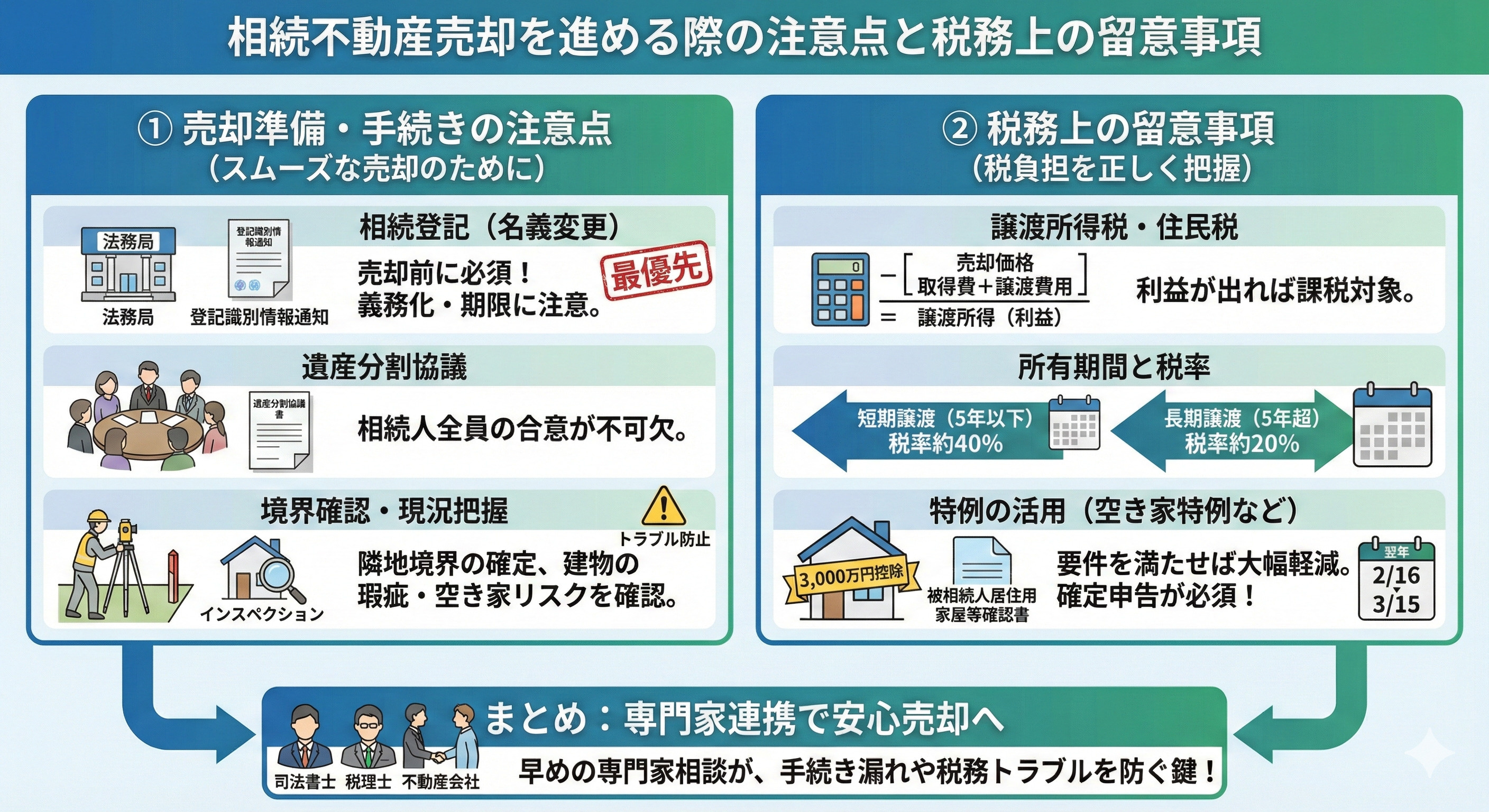 相続により取得した不動産を売却する際には、税務上の特例や控除を適正に活用することで、譲渡所得税の負担を軽減できる可能性があります。以下に主要な注意点をわかりやすく表形式で整理しました。