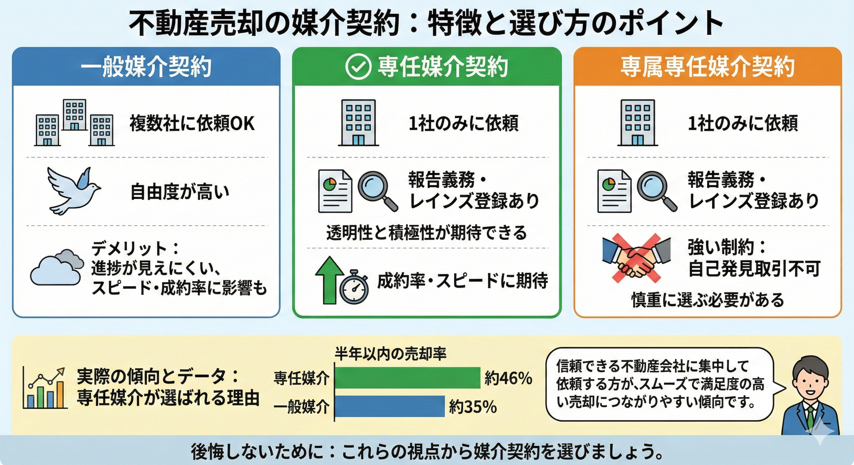 「不動産売却で後悔したくない方」には、以下の視点から媒介契約を選ぶことをおすすめいたします: