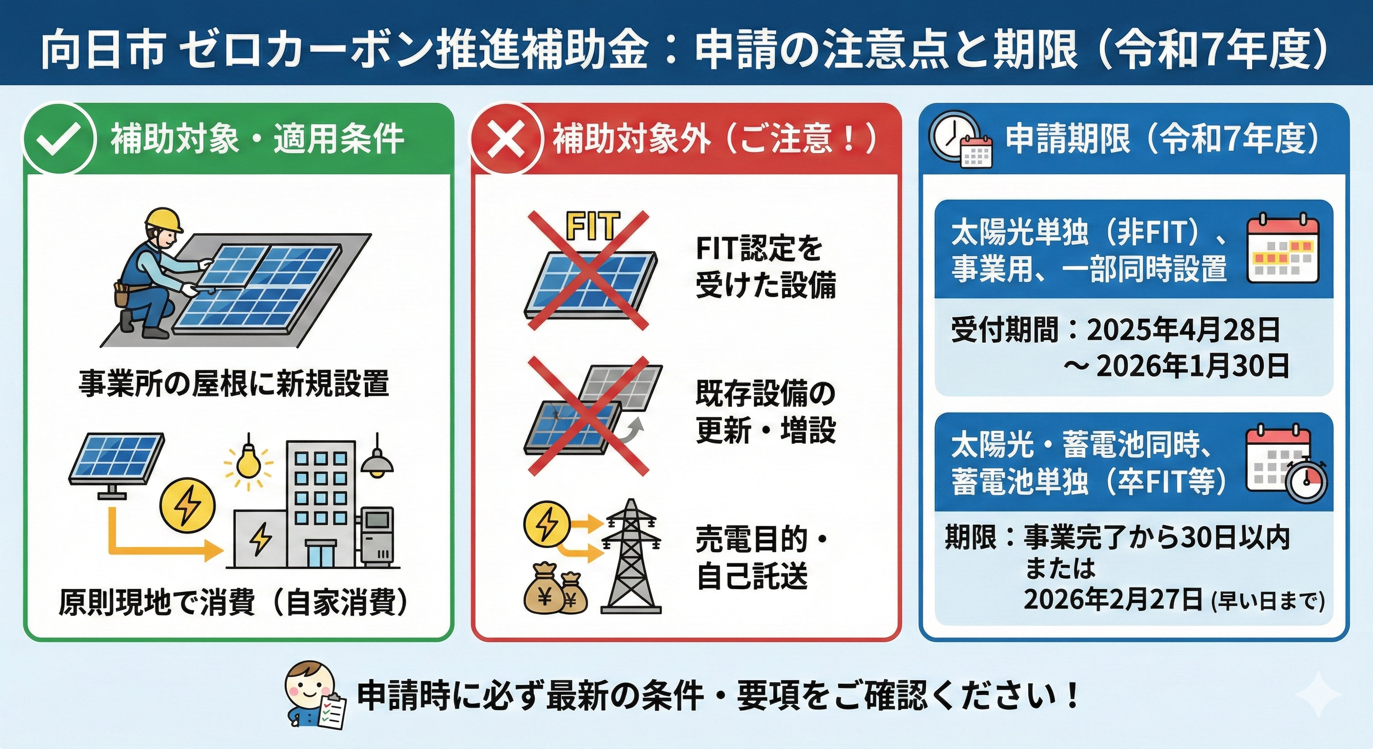向日市のゼロカーボン推進補助金における申請条件と注意点をご案内いたします。以下の条件を満たす必要があります。
