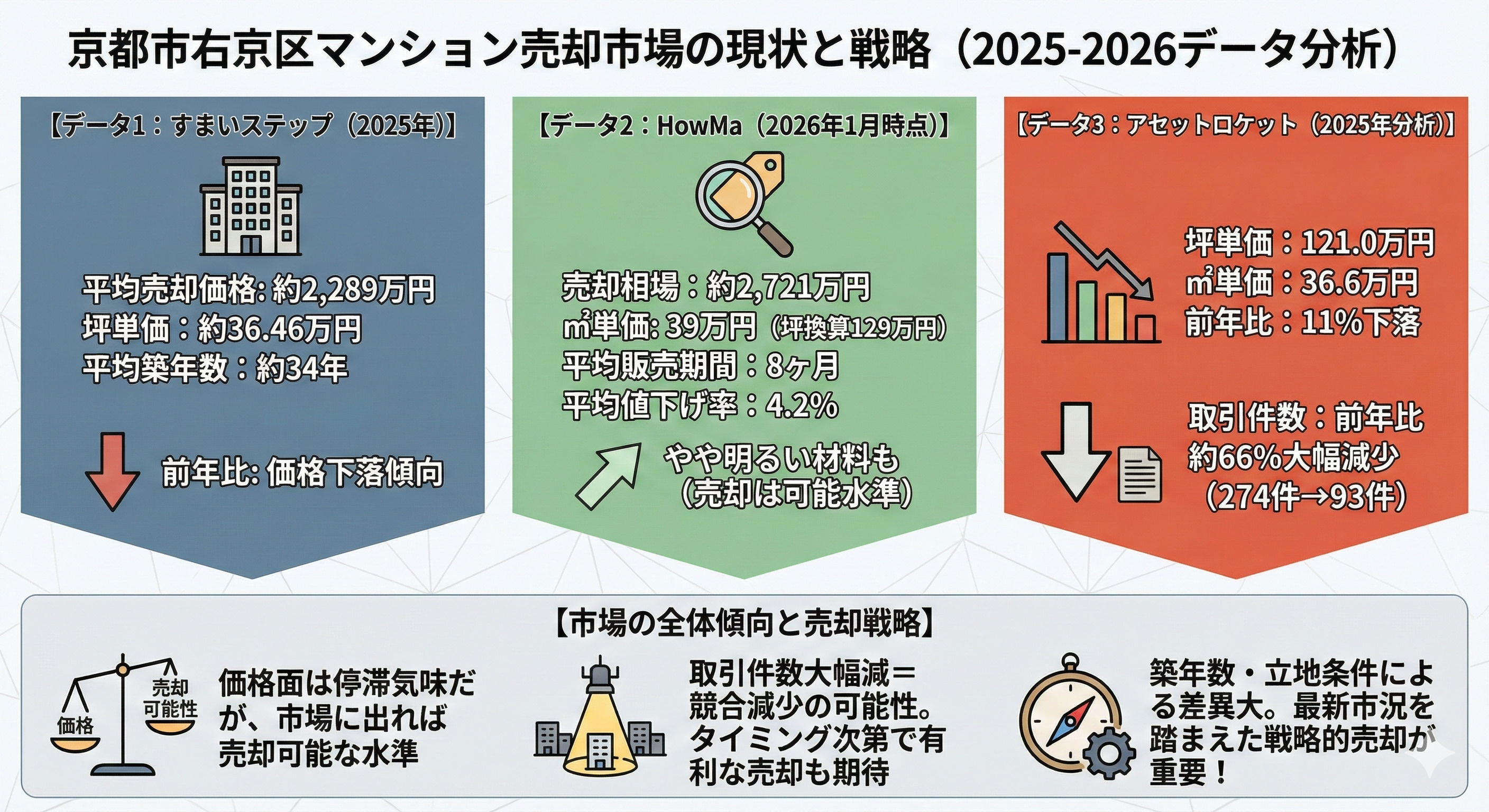 まず、売り出し価格設定は市場データを踏まえることが重要です。例えば、HowMaのデータによれば、2026年1月時点で右京区のマンション売却相場は約2721万円、1平方メートルあたり約39万円、坪単価では約129万円となっています。また、成約までにかかる平均期間は8か月、値下げ率は平均約4.2%です(HowMa)