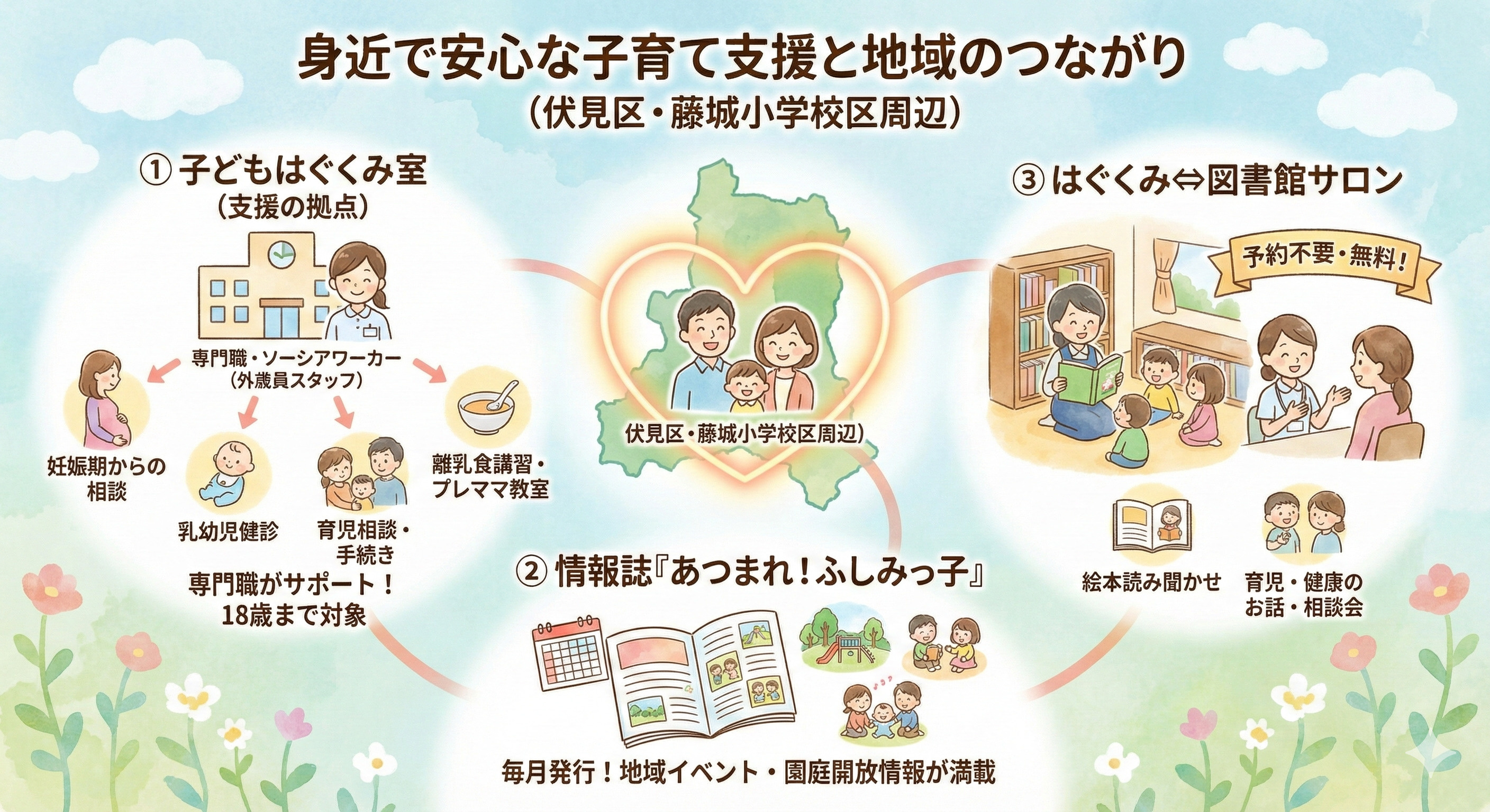 | あつまれ!ふしみっ子・図書館連携サロン | 地域のイベント情報誌、絵本読み聞かせ・育児健康相談 | 毎月情報更新、予約不要で参加可能 |
