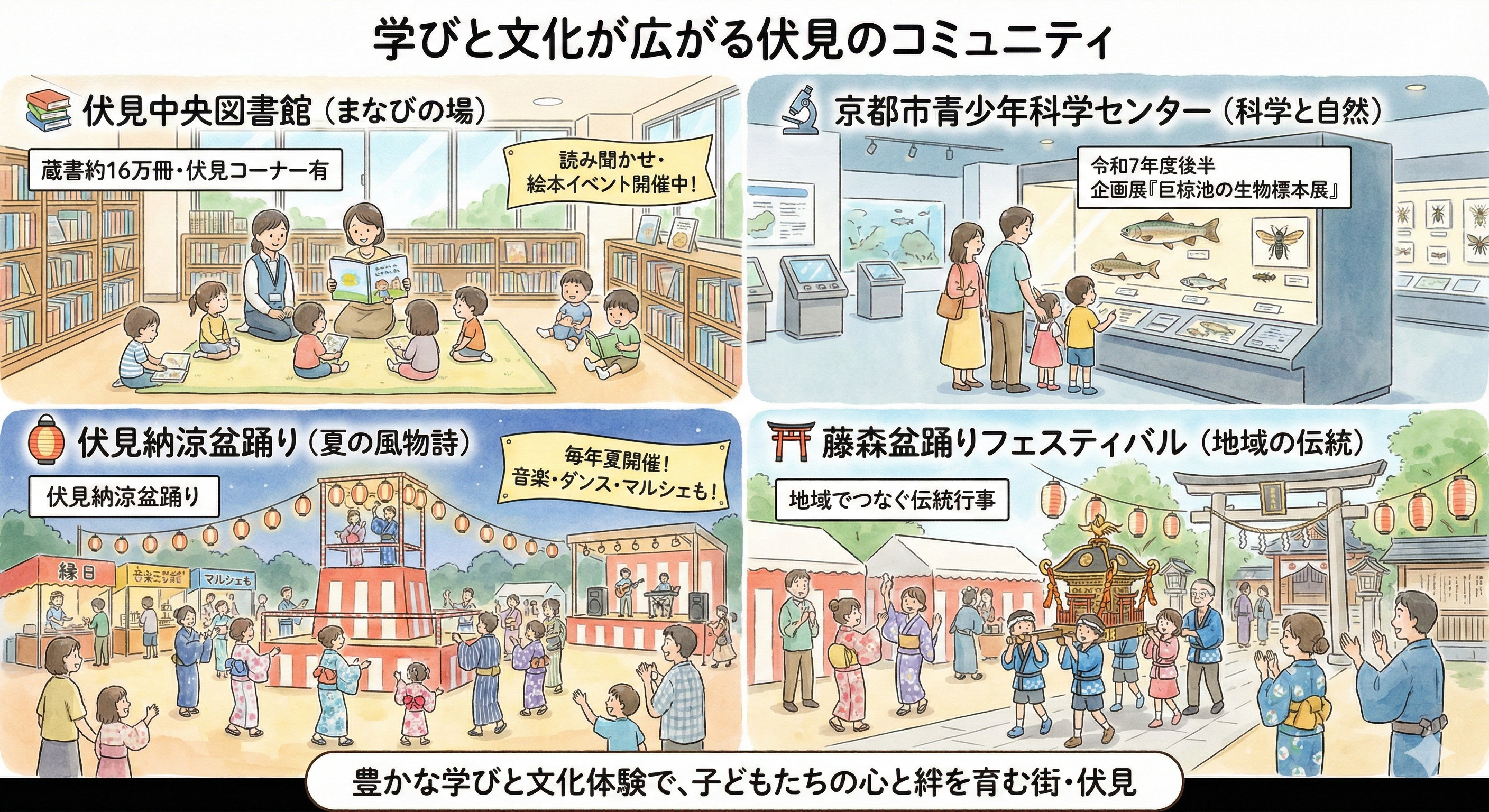 地域の文化・伝統に触れる機会も充実しています。たとえば、伏見港公園では毎年夏に「伏見納涼盆踊り」が開催され、多彩な音楽やダンスのステージ、縁日やマルシェもあり、親子で夏の夜を楽しめるイベントとして定着しています。また、藤森神社周辺では「藤森盆踊りフェスティバル」が実施され、地域をあげての祭りとして子どもたちも一緒に地域の伝統に触れることができます。