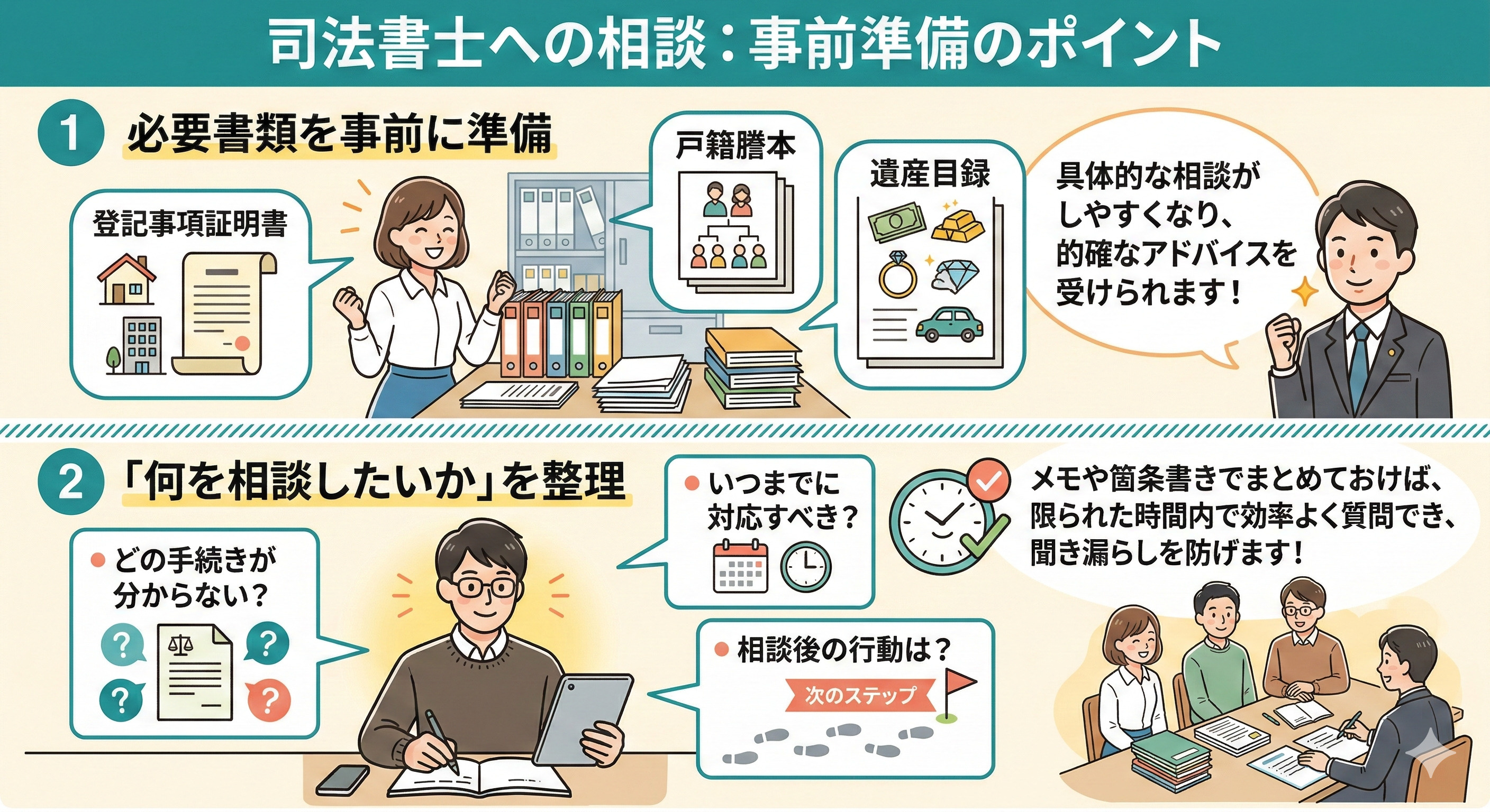 司法書士による無料相談会に参加する際には、「スムーズで有意義な相談」を実現するために、以下のような準備をしておくことが大切です。
