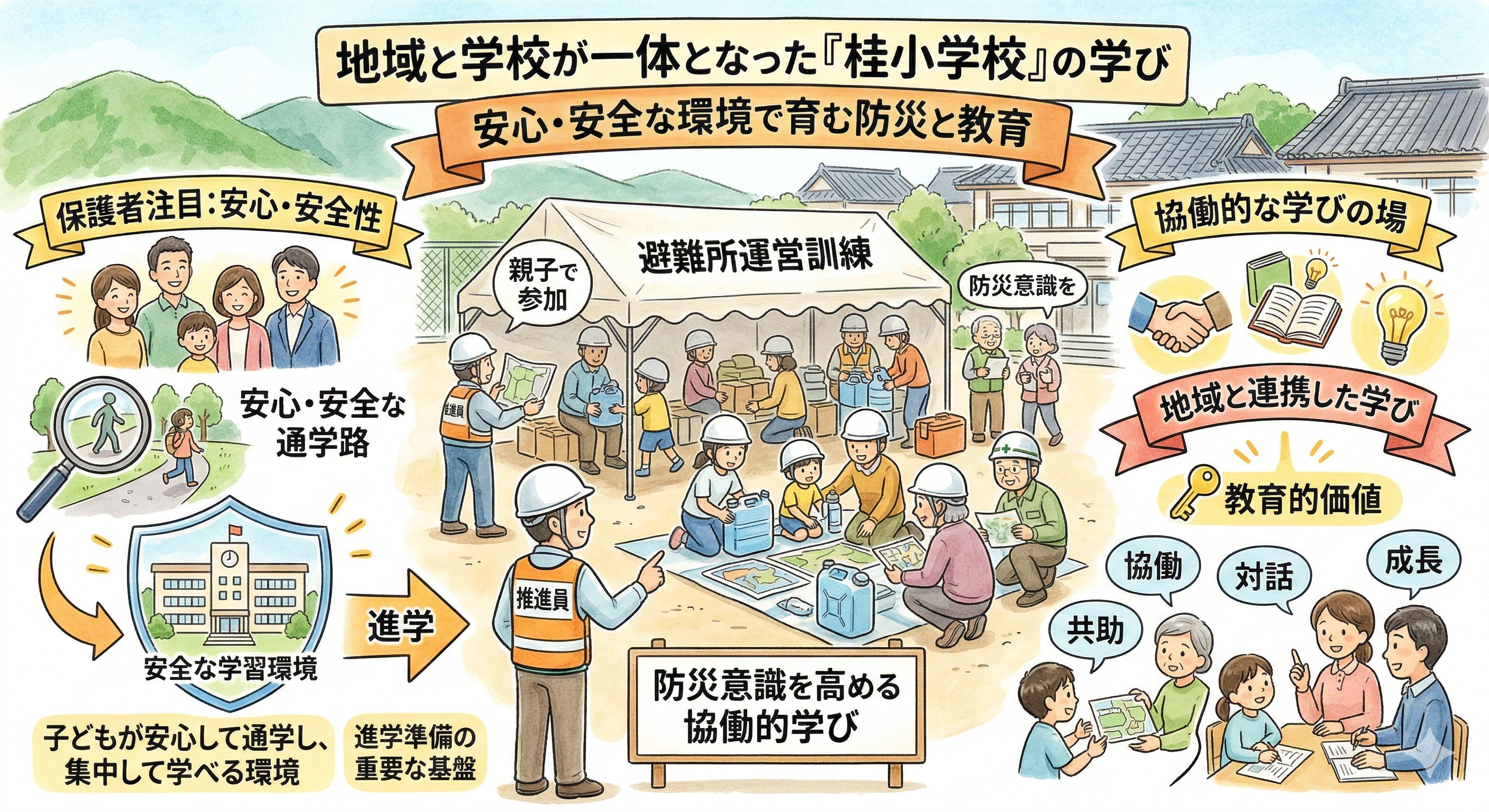 次に、地域と連携した学びの機会にも注目です。桂小学校では「地域学校協働活動推進員」が配置され、地域と学校が一体となった防災イベントなどの活動が行われています。たとえば、親子で参加できる避難所運営訓練が開催され、防災意識を高めるとともに、協働的な学びの場として教育的価値を持たせています。